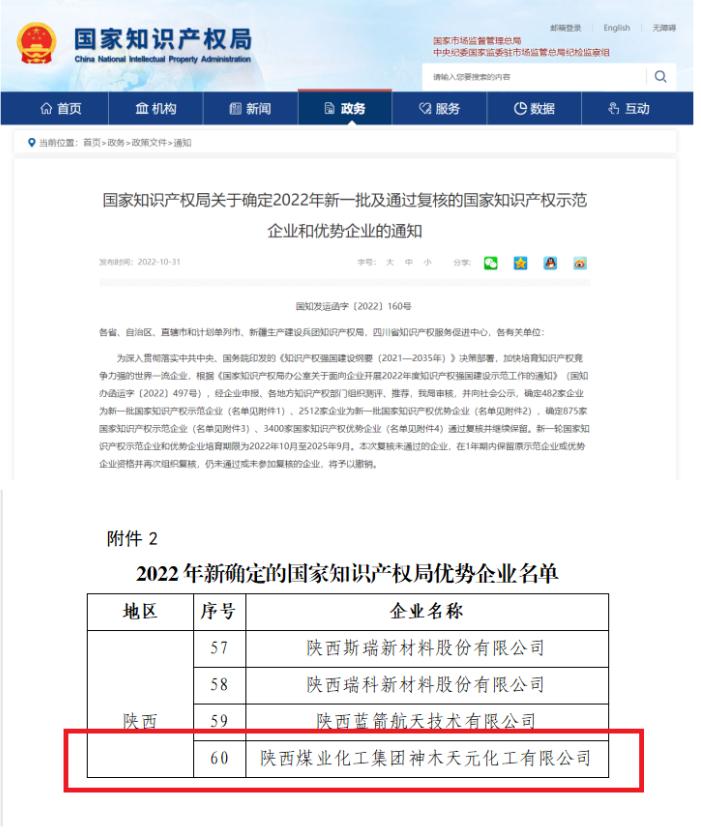 訪問次數:3766近日,從《國家知識產權局關于確定2022年新一批及通過復核的國家知識產權示范企業和優勢企業的通知》獲悉,神木煤化工天元公司入選202... -