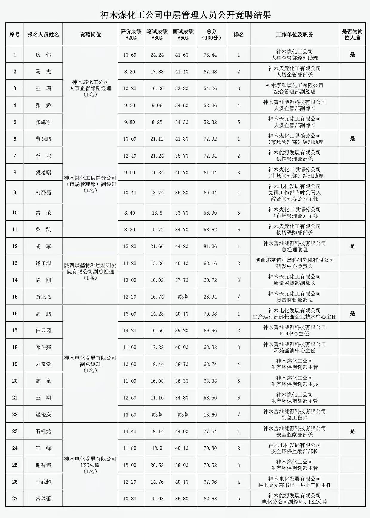 神木煤化工公司中層管理人員公開(kāi)競(jìng)聘結(jié)果公告