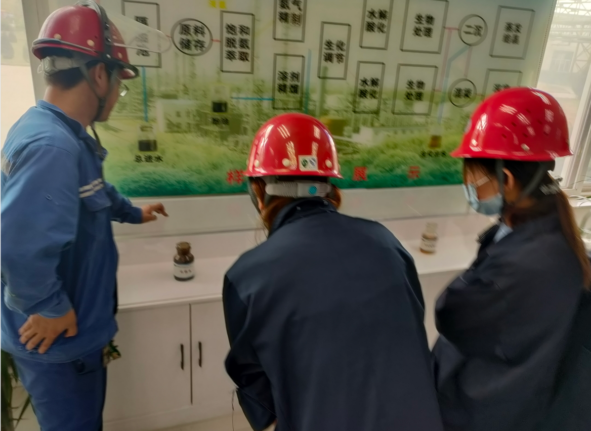 隨后,參觀人員在安全環保部相關人員的帶領下,深入公用車間污水處理裝置區,通過工作人員的詳細介紹,大家了解到,天元公司建成的100t/h煤焦油輕質化廢水處理項目,利用“預處理+生化處理+深度處理”三級處理工藝,有效降低廢水中的焦油、氨氮、酚類固體懸浮物等,處理后的回用水作為循環水補充水和熄焦水,實現中水回用和工業污水零排放,大大地減少了能源的使用和生產水采購成本。在公用車間控制室,大家還觀看了原料污水和處理后的中水樣品,深刻感受了污水在處理前后的巨大變化,并對污水處理工藝技術的先進性和清潔生產水平給予了充分的肯定。