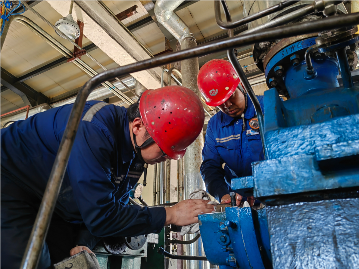 檢修車間張福恩和汪起云在更換預(yù)處理車間氣動(dòng)旋塞閥