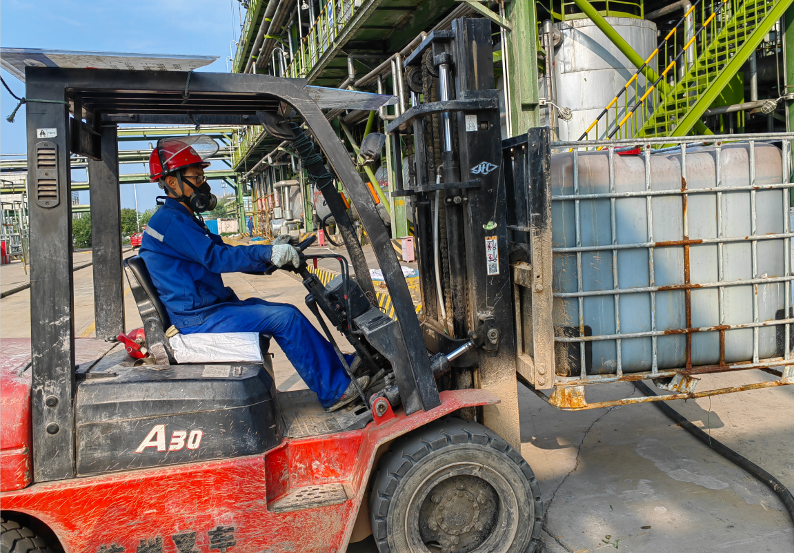精酚車間崔小云用叉車搬運(yùn)噸桶