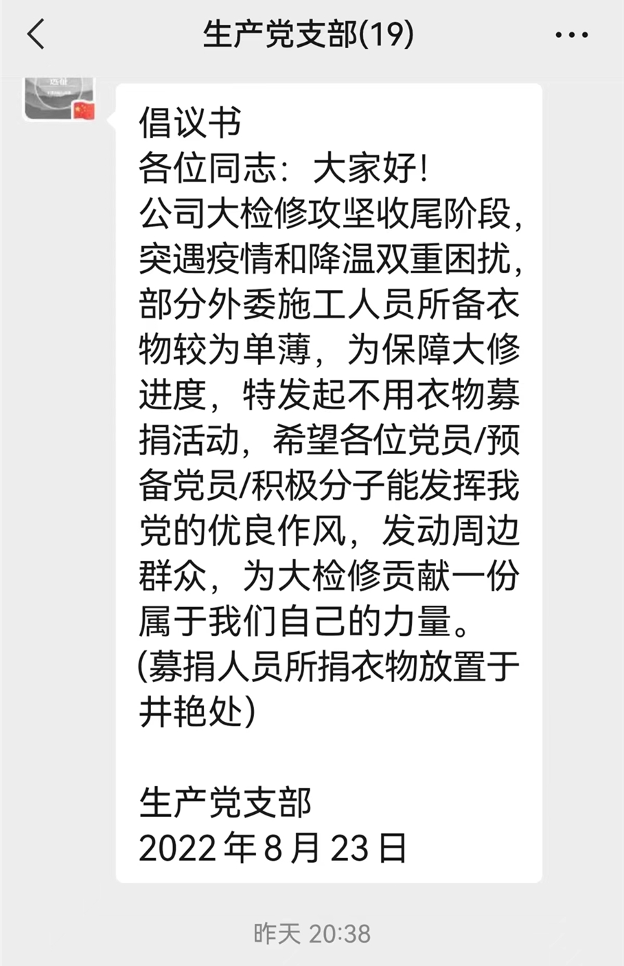 8月23日,一份倡議書出現(xiàn)在了生產(chǎn)黨支部群里,神木煤化工泰和公司大檢修攻堅(jiān)收尾階段,突遇疫情和降溫雙重困擾,部分外委施工人員所備衣物較為單薄,特發(fā)起衣物募捐活動(dòng)。