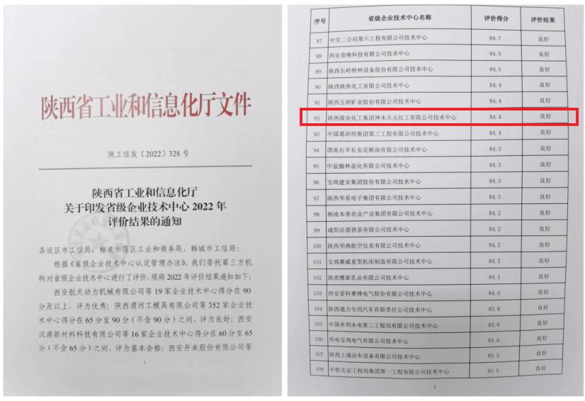 近日,從《陜西省工業(yè)和信息化廳關(guān)于印發(fā)省級企業(yè)技術(shù)中心2022年評價結(jié)果的通知》獲悉,神木煤化工天元公司技術(shù)中心順利通過省級企業(yè)技術(shù)中心評價,評價結(jié)果為“良好”。