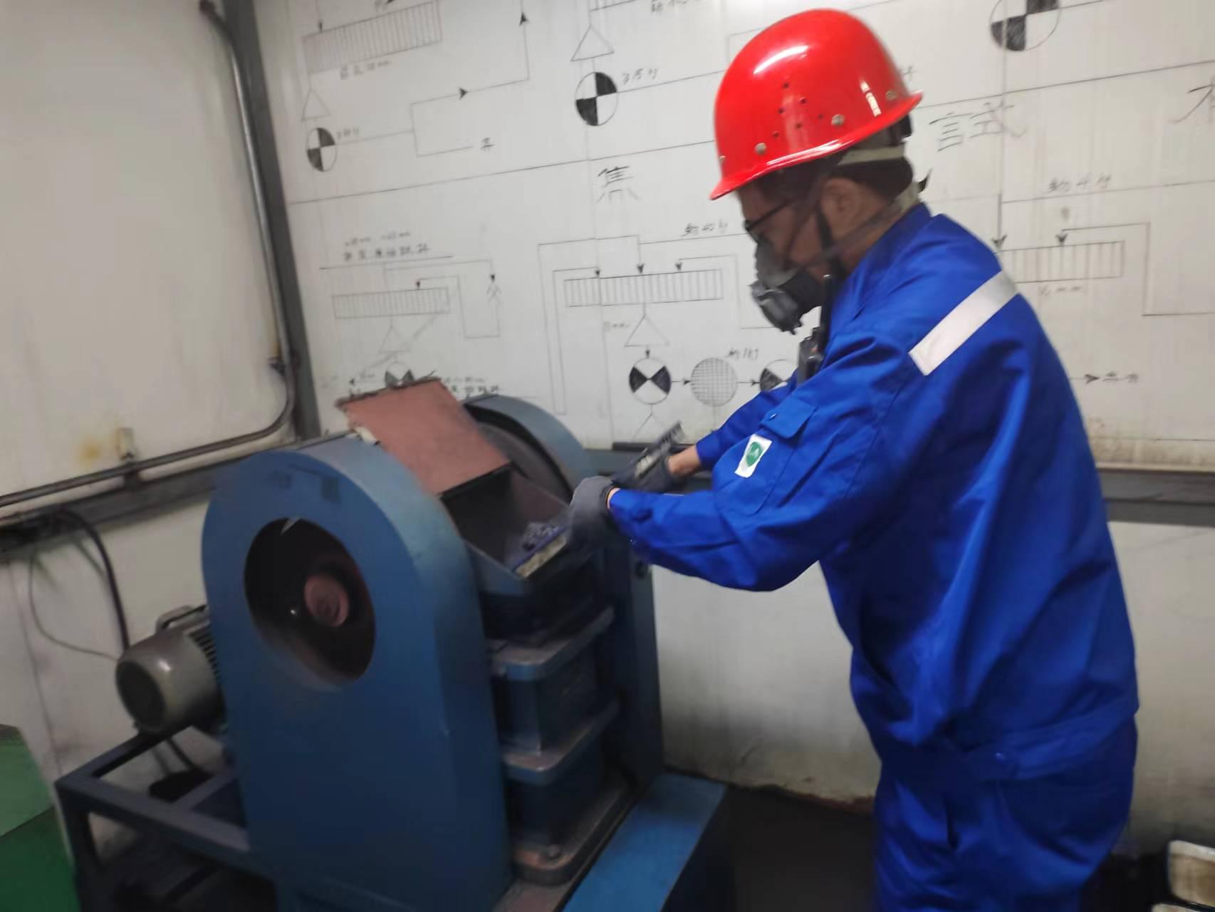 走進樣品破碎間,伴隨著破碎機的轟鳴聲,只見王平佩戴著全套安全防護用品,認真地操作著。