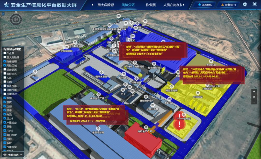 風險分級管控通過《風險評估清單》,系統會自動生成隱患排查工作任務,由指定的排查人員進行現場風險評估確認,如未及時進行隱患排查任務時,系統將會自動在調度指揮中心的三維地圖上出現預警提示。