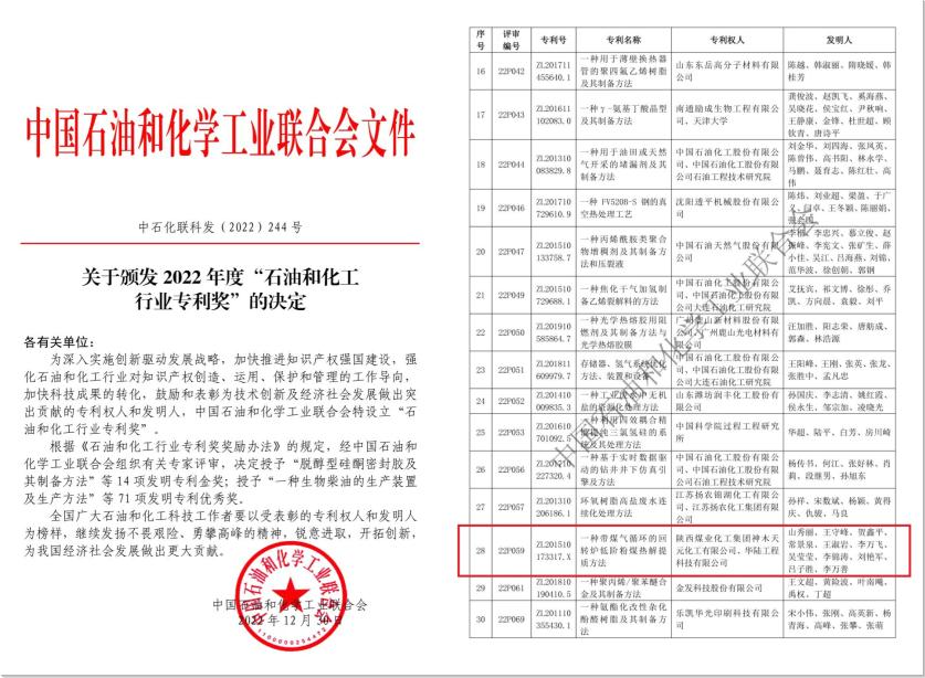 奮進陜煤:神木煤化工天元公司一發明專利榮獲2022年度中國石油和化工行業專利優秀獎