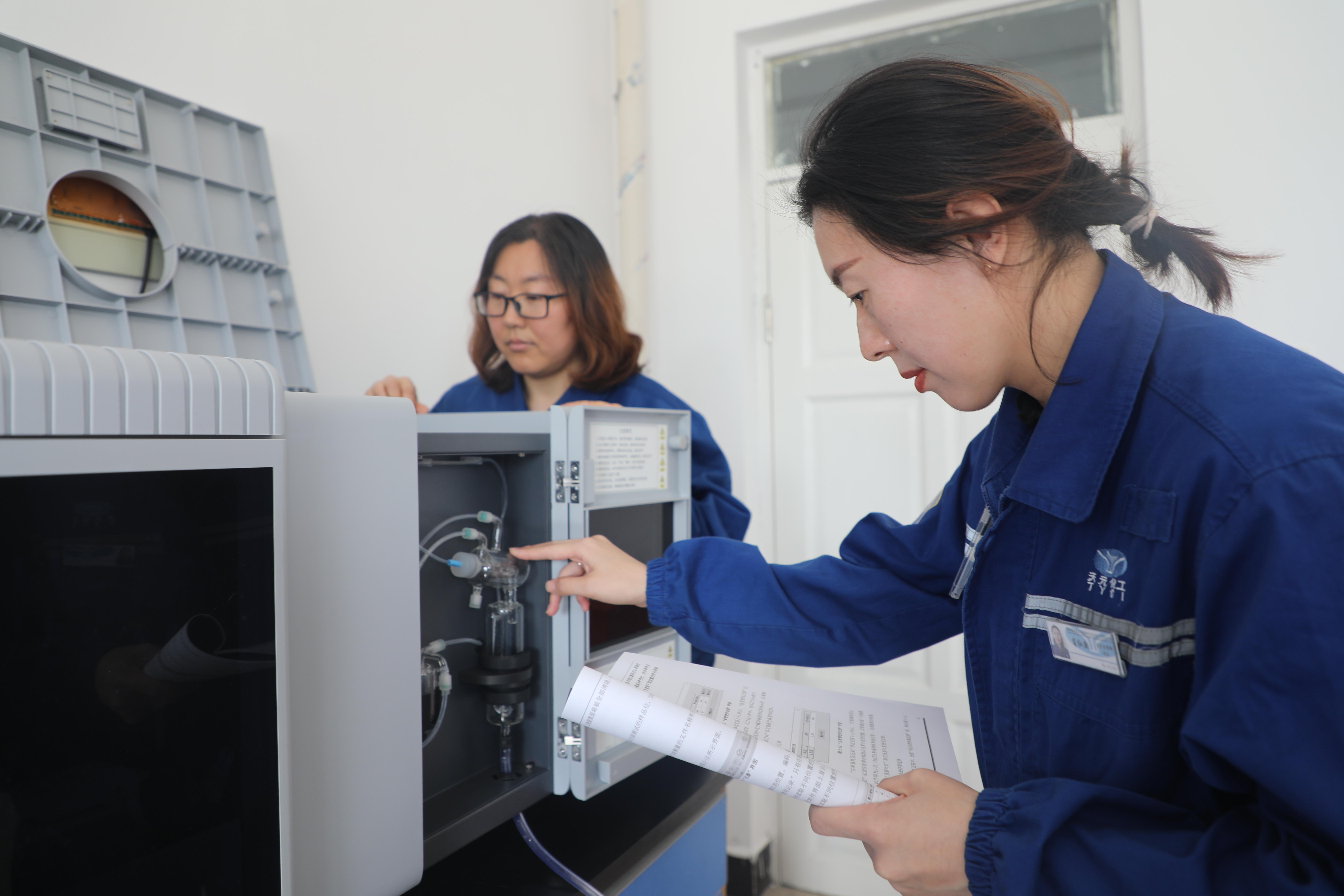 質量監督部姬飛燕和肖紅魚在學習水質分析儀器使用方法