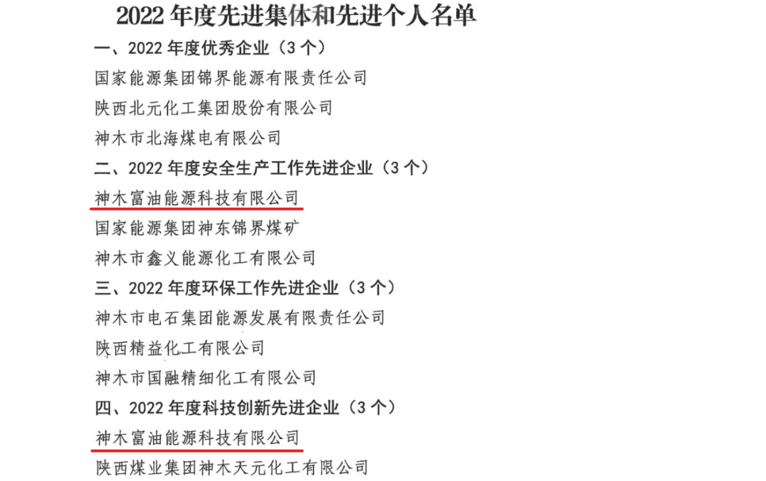 近日,神木煤化工富油公司榮獲神木高新技術產業開發管理委員會2022年度安全生產工作先進企業、科技創新先進企業等榮譽稱號;該公司副總工程師、安全環保部部長張文祖榮獲2022年度安全生產先進個人,王鳳婭榮獲2022年度統計工作先進個人。