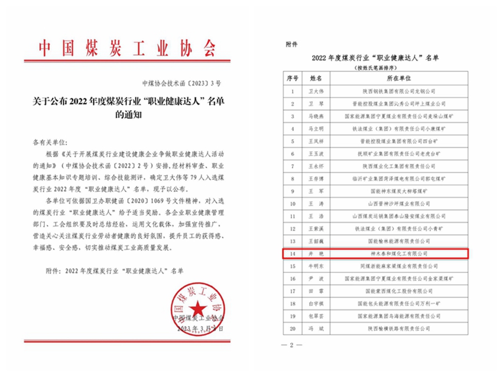 近日,神木煤化工泰和公司井艷被中國煤炭工業(yè)協(xié)會評為2022年度煤炭行業(yè)“職業(yè)健康達人”。井艷同志是該公司安全環(huán)保部職業(yè)衛(wèi)生專職管理人員,主要負責職業(yè)衛(wèi)生管理工作。