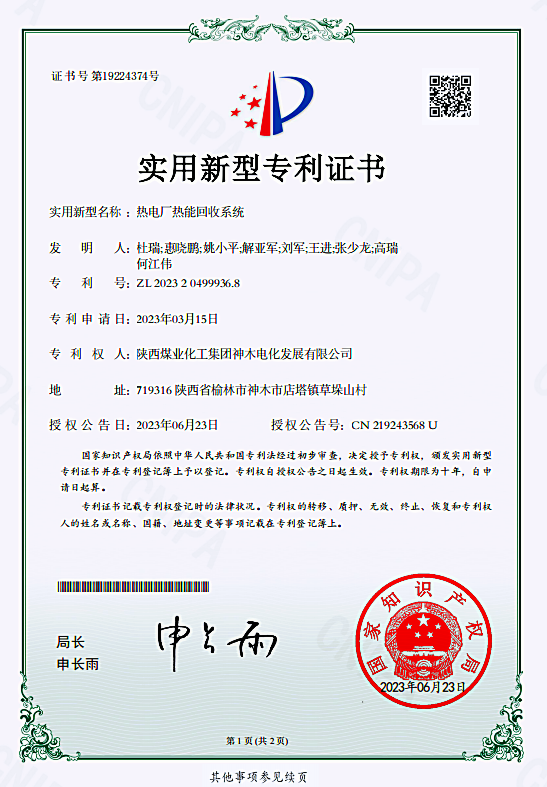 近日,神木煤化工電化公司“熱電廠熱能回收系統”榮獲實用新型專利授權。