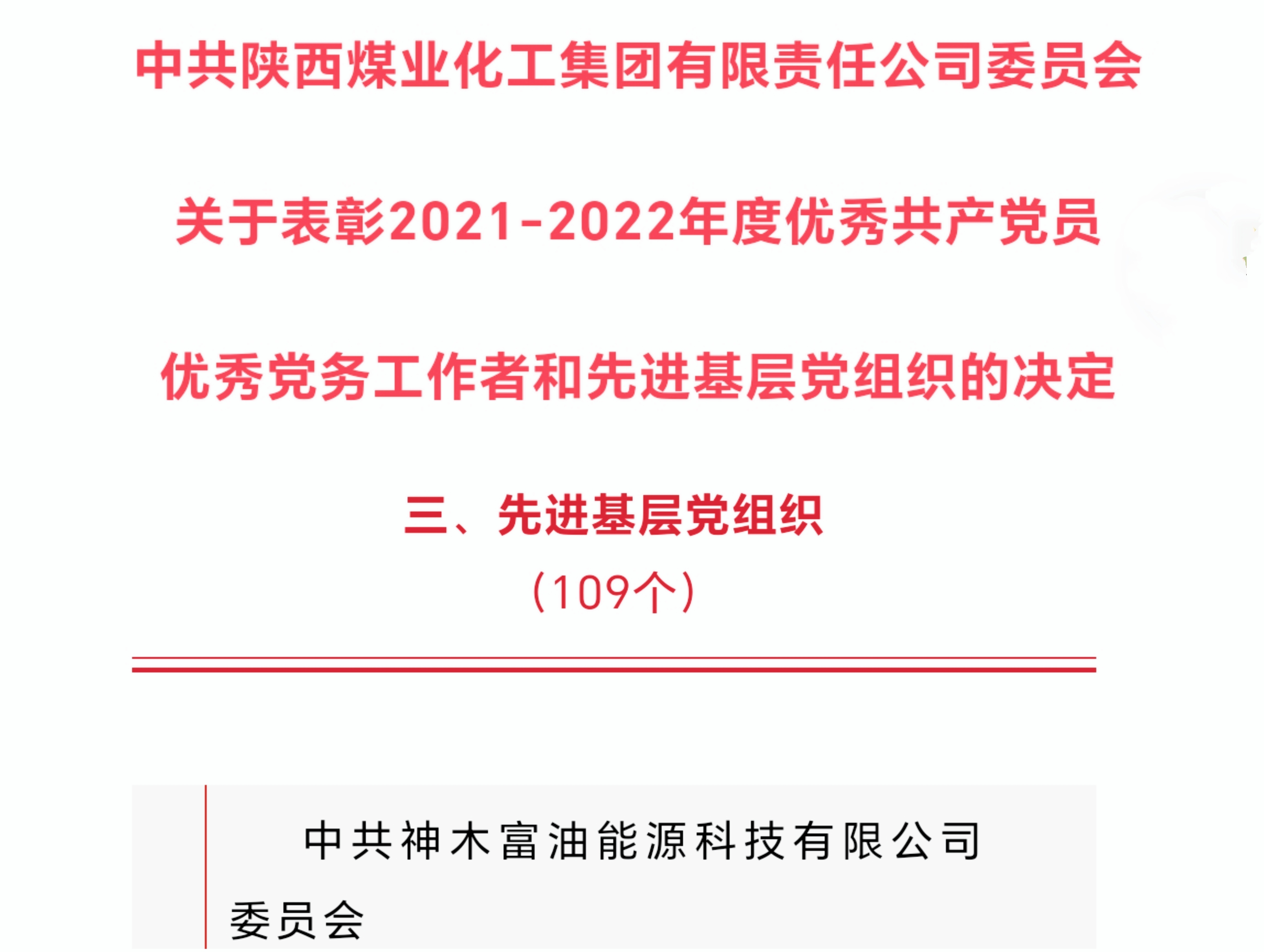在慶祝中國共產黨成立102周年之際,陜煤集團表彰了一批“兩優一先”先進基層黨組織、優秀共產黨員和優秀黨務工作者,神木煤化工富油公司黨委榮獲“先進基層黨組織”稱號。