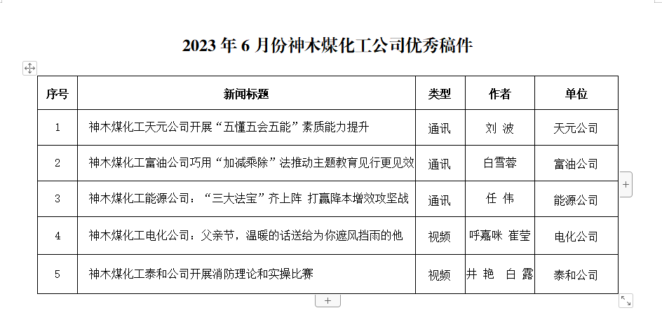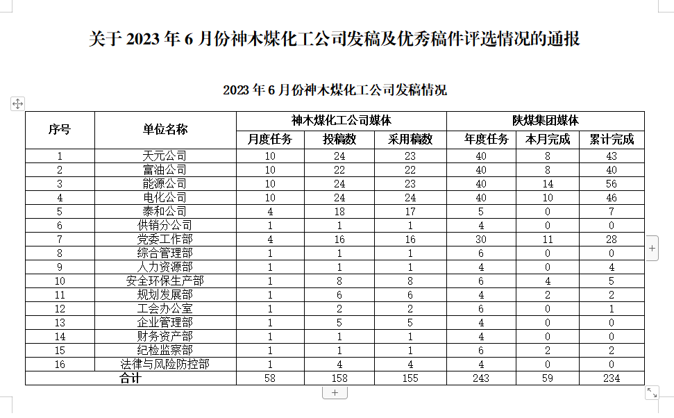 關于2023年6月份神木煤化工公司發稿及優秀稿件評選情況的通報