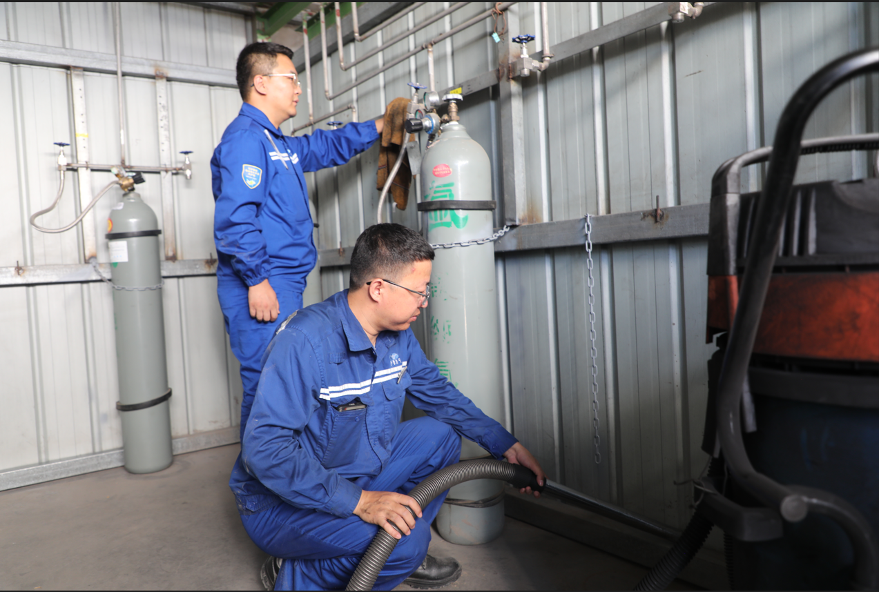質量監督部運行二班劉超和馮杰在清理氬氣瓶間衛生