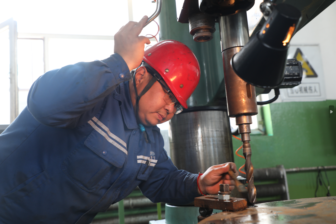 檢修車間鉗工班宋冬宇在用鉆床加工法蘭盲蓋