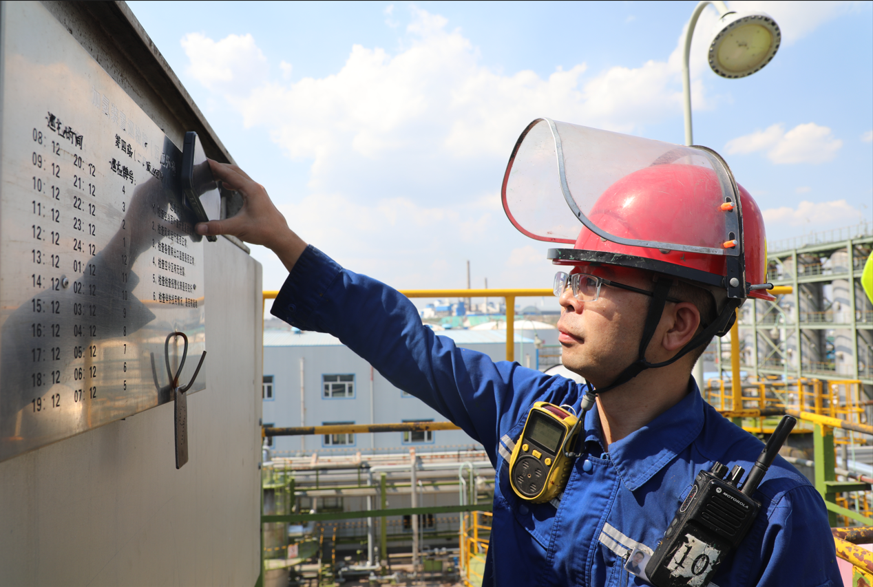 加氫車間二班拓宏博在二段空冷平臺巡檢點使用防爆手機進行打卡