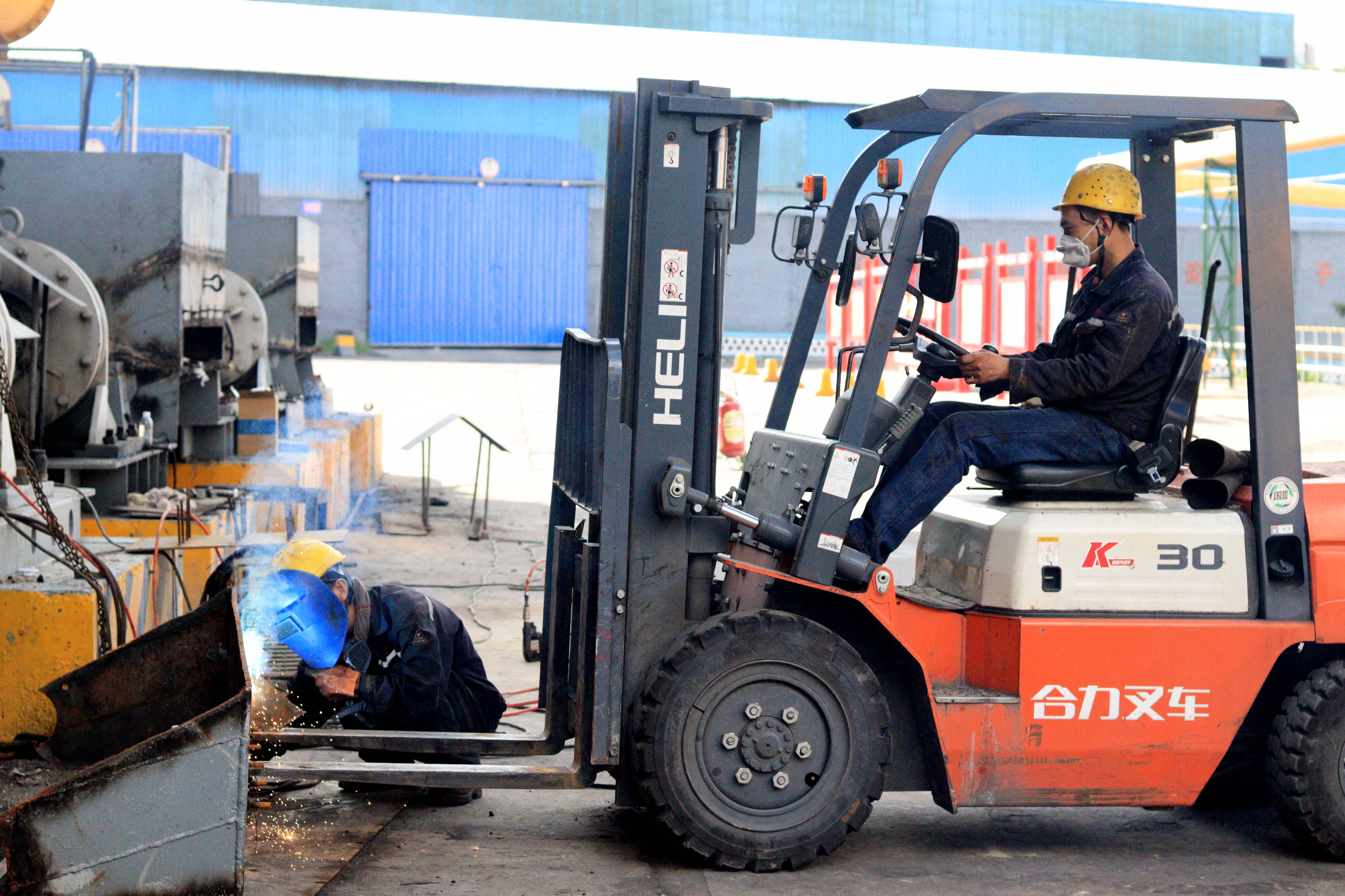 “往左一點(diǎn)點(diǎn),對(duì),再往前一點(diǎn),OK可以了”3#刮板機(jī)前,一人負(fù)責(zé)著指揮方向,一人負(fù)責(zé)駕駛叉車(chē)搬運(yùn)刮板機(jī)頭擋板,另一個(gè)人確認(rèn)方向位置無(wú)誤后,手持電焊,伴隨著耀眼的焊花進(jìn)行著焊接工作,在此之前,他們已經(jīng)合力完成了鏈輪及軸套的維修和更換。