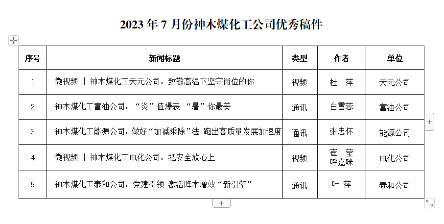 關于2023年7月份神木煤化工公司發稿及優秀稿件評選情況的通報