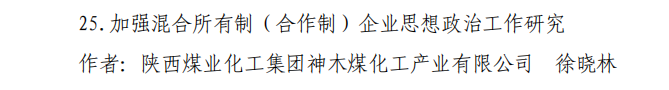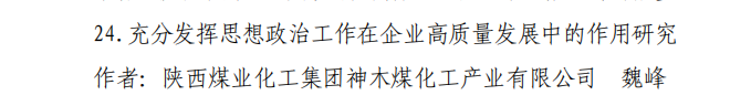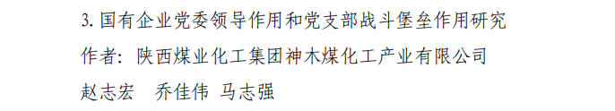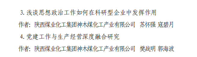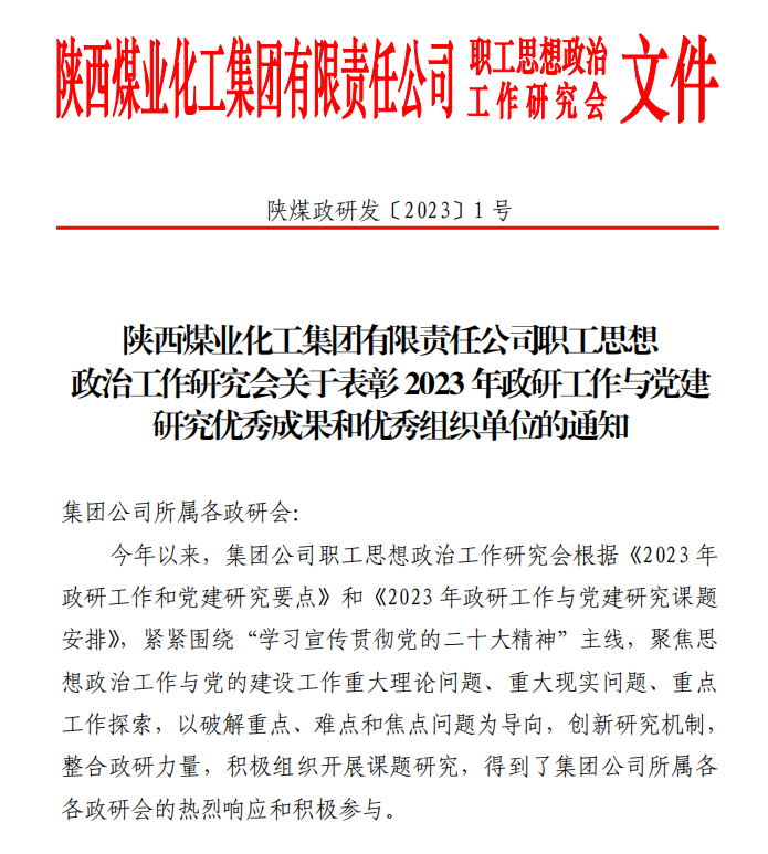 近日,陜煤集團下發(fā)了《關(guān)于表彰2023年政研工作與黨建研究優(yōu)秀成果和優(yōu)秀組織單位的通知》,公布了2023年政研工作與黨建研究優(yōu)秀成果及優(yōu)秀組織單位名單,神木煤化工公司榮獲三個三等獎和五個優(yōu)秀獎。