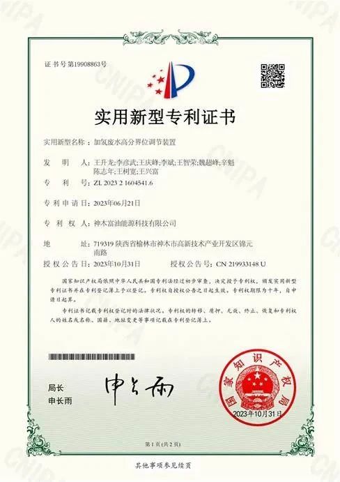 近日,神木煤化工富油公司申請的“加氫廢水高分界位調節裝置 ”實用型專利獲得國家知識產權局授權。
