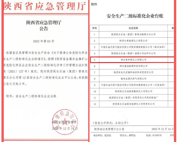 近日,從陜西省應急管理廳公告獲悉,神木泰和煤化工有限公司順利通過安全生產標準化二級認證,成為陜西省應急管理廳公告的“首家神木市蘭炭行業安全生產二級標準化企業”。
