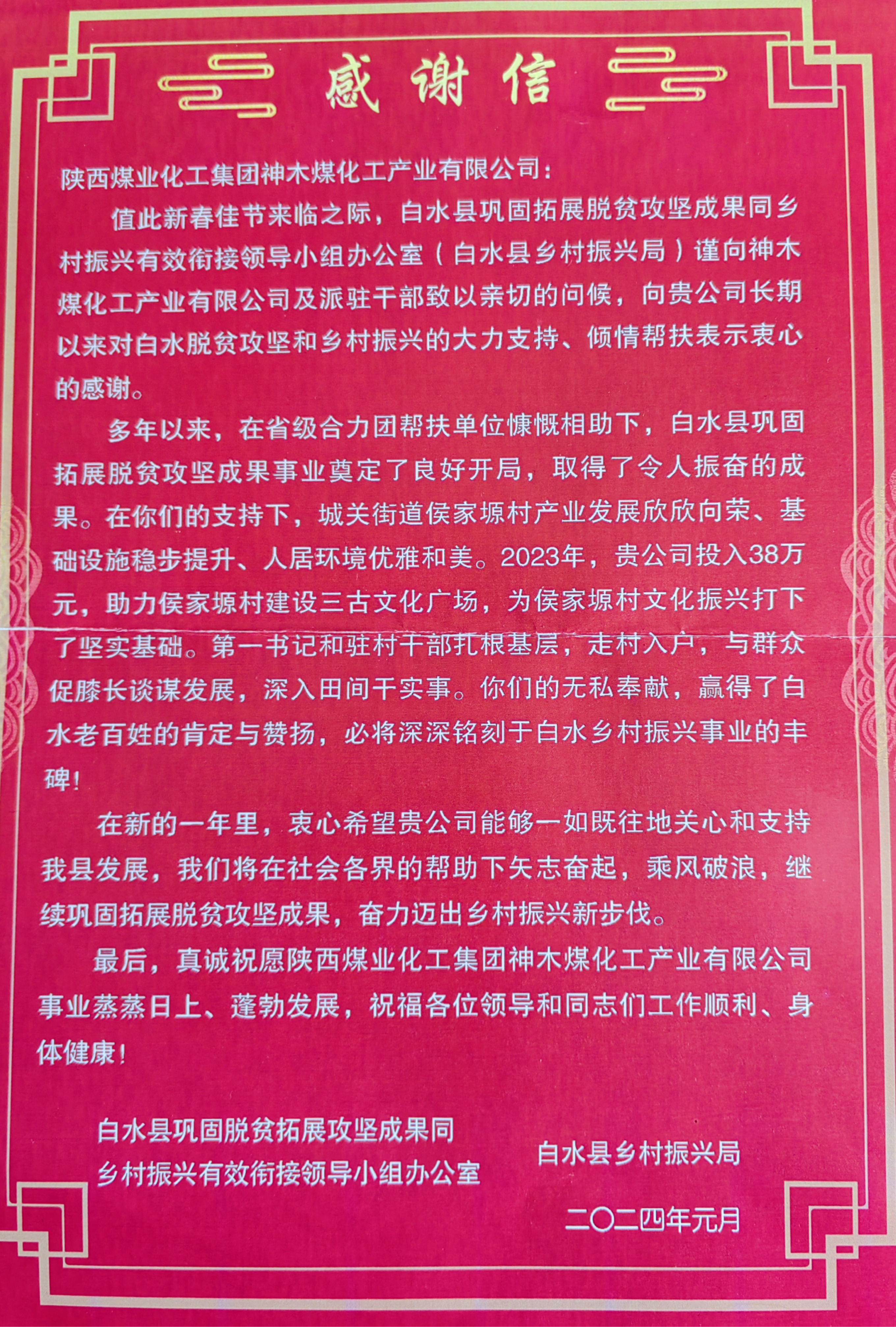 在這年味未盡春意發的日子里,神木煤化工公司再次收到來自白水縣鞏固拓展脫貧攻堅成果同鄉村振興有效銜接領導小組辦公室(白水縣鄉村振興局)的感謝信,連續3年3封信,不斷訴說著村企攜手共繪和美鄉村新畫卷的背后故事。