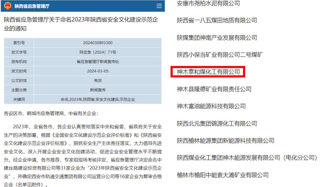 3月5日,陜西省應(yīng)急管理廳印發(fā)了《關(guān)于命名2023年陜西省安全文化建設(shè)示范企業(yè)的通知》,神木煤化工泰和公司榮獲“2023年度陜西省安全文化建設(shè)示范企業(yè)”。這是泰和公司繼獲得全省蘭炭行業(yè)首家安全生產(chǎn)二級標(biāo)準(zhǔn)化企業(yè)后,又獲評的一個重要榮譽(yù)稱號,也是安全生產(chǎn)管理的又一項(xiàng)重大突破。