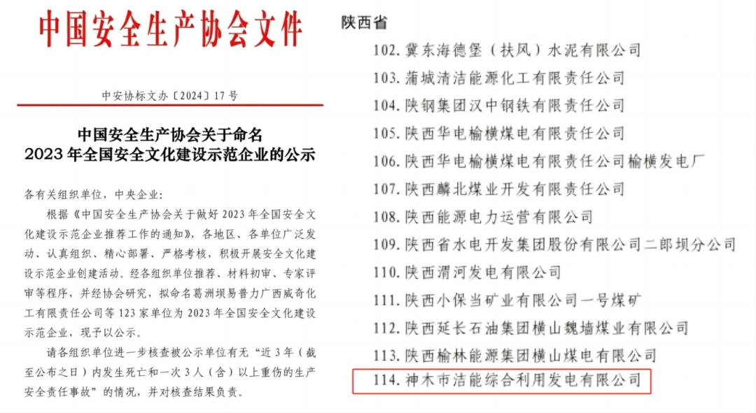 近日,神木煤化工能源公司潔能發(fā)電分公司(神木市潔能綜合利用發(fā)電有限公司)榮獲“全國安全文化建設(shè)示范企業(yè)”榮譽稱號,同時也是神木煤化工公司首家“全國安全文化建設(shè)示范企業(yè)”。