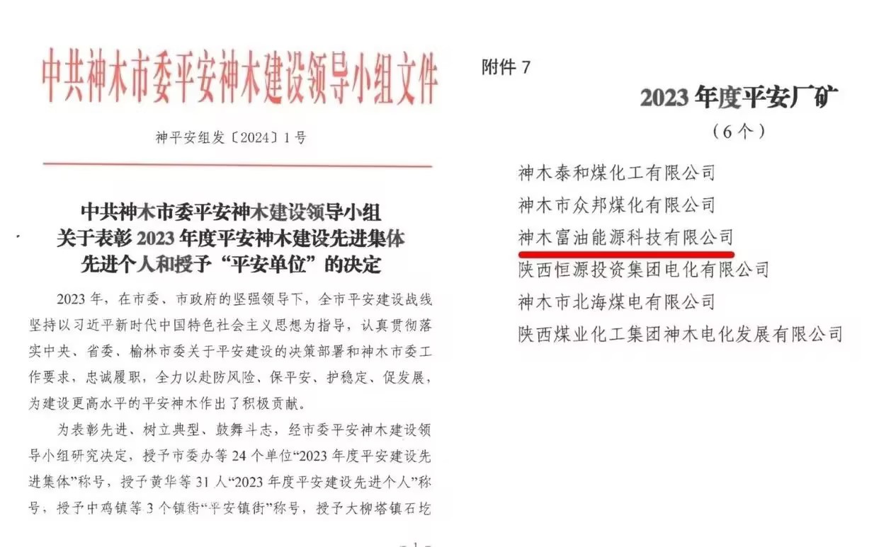 近日,從中共神木市委平安神木建設(shè)領(lǐng)導(dǎo)小組獲悉,神木煤化工富油公司榮獲“平安廠礦”稱號(hào)。