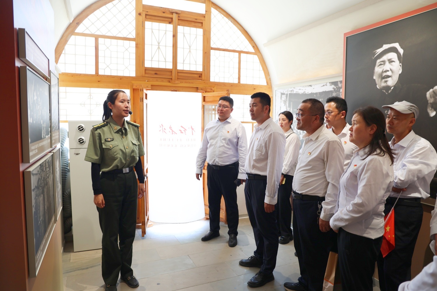 在講解員的引導下,全體人員參觀了綏德革命紀念館。館內展陳以“西北人民革命的一面光輝旗幟”為主題,布設“西北革命運動興起的策源地”“陜北土地革命斗爭的中心區”“抗日民主根據地的模范區”“奪取全國勝利的出發點”四大板塊,全面展示了中國共產黨在綏德、榆林乃至西北地區波瀾壯闊的革命歷程。一幕幕歷史畫面徐徐展開,一則則動人故事娓娓道來,大家踏著革命偉人和先烈們的足跡,緬懷毛澤東、周恩來、習仲勛等老一輩革命家為了民族獨立和解放,戰天斗地,改天換日的革命歷程,全體黨員重溫了入黨誓詞。