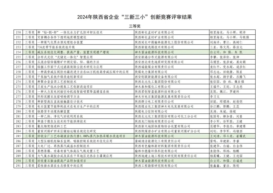 近日,陜西省科學技術協會公布了2024年陜西省企業“三新三小”創新競賽評審結果,富油公司申報的3項成果獲競賽三等獎。
