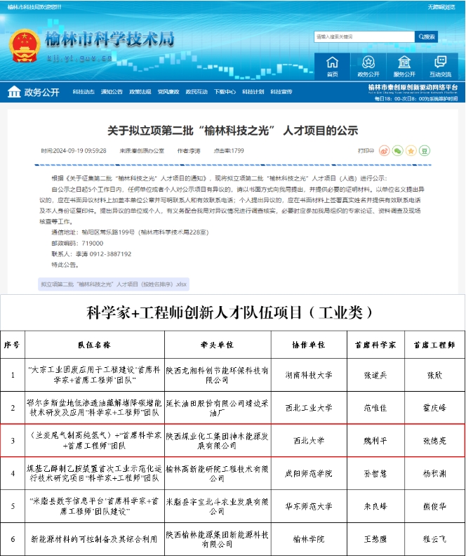 喜訊!能源公司創新人才項目入選第二批“榆林科技之光”