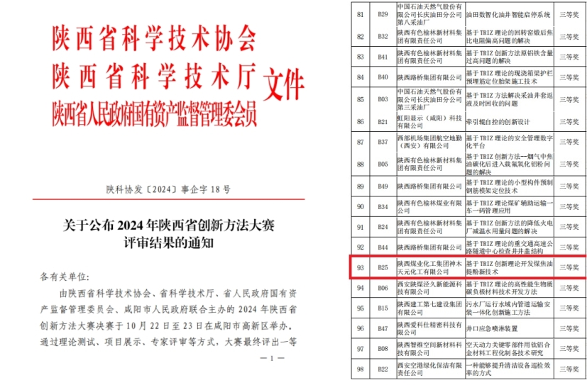 近日,陜西省科學(xué)技術(shù)學(xué)會公布了2024年陜西省創(chuàng)新方法大賽評審結(jié)果,神木煤化工天元公司“基于TRIZ創(chuàng)新理論開發(fā)煤焦油提酚新技術(shù)”創(chuàng)新成果經(jīng)過項(xiàng)目展示、現(xiàn)場答辯、專家點(diǎn)評等多環(huán)節(jié)的激烈角逐,脫穎而出,榮獲三等獎。