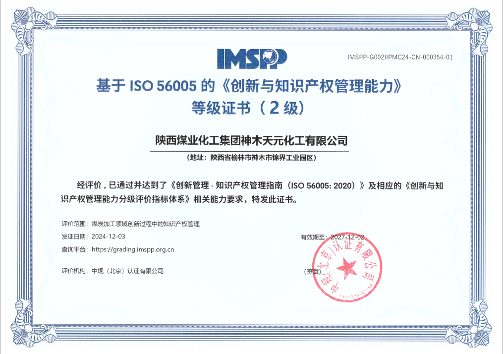 近年來,天元公司認(rèn)真貫徹落實陜煤集團(tuán)和神木煤化工公司關(guān)于知識產(chǎn)權(quán)管理體系建設(shè)的相關(guān)要求,不斷推動創(chuàng)新與知識產(chǎn)權(quán)工作提質(zhì)增效。先后榮獲中國專利優(yōu)秀獎、陜西省專利一等獎,截至目前,公司獲得國家有效授權(quán)專利140件,其中發(fā)明專利47件,實用新型專利93件;同時,多項創(chuàng)新成果先后在陜西省創(chuàng)新方法大賽、陜西省企業(yè)“三新三小”創(chuàng)新競賽、榆林市“秦創(chuàng)原”高價值專利轉(zhuǎn)移轉(zhuǎn)化大賽中獲獎。
