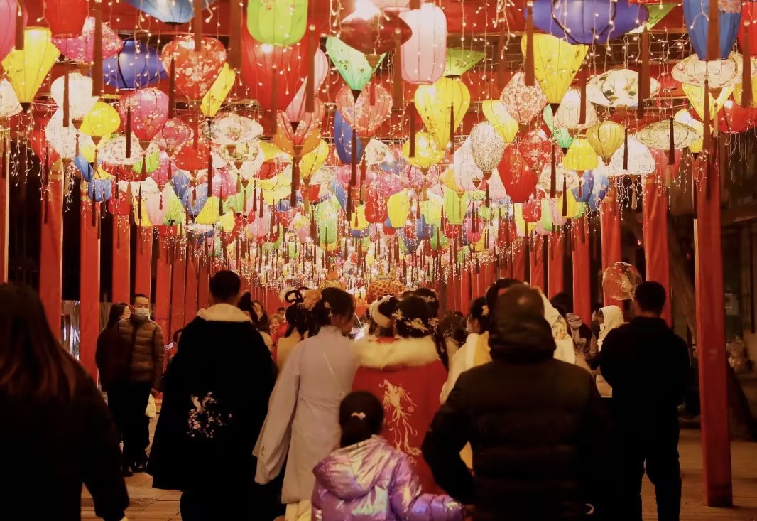 我們順著人流,慢慢挪到了鐘樓洞跟前,一抬頭,大紅燈籠高高掛,上面畫著蛇年的吉祥圖案,還有一些寫著祝福話語的,在微風里輕輕晃悠。旁邊的樹上也掛滿了彩燈,一閃一閃的,像漫天星辰遺落在了這麟州街。
