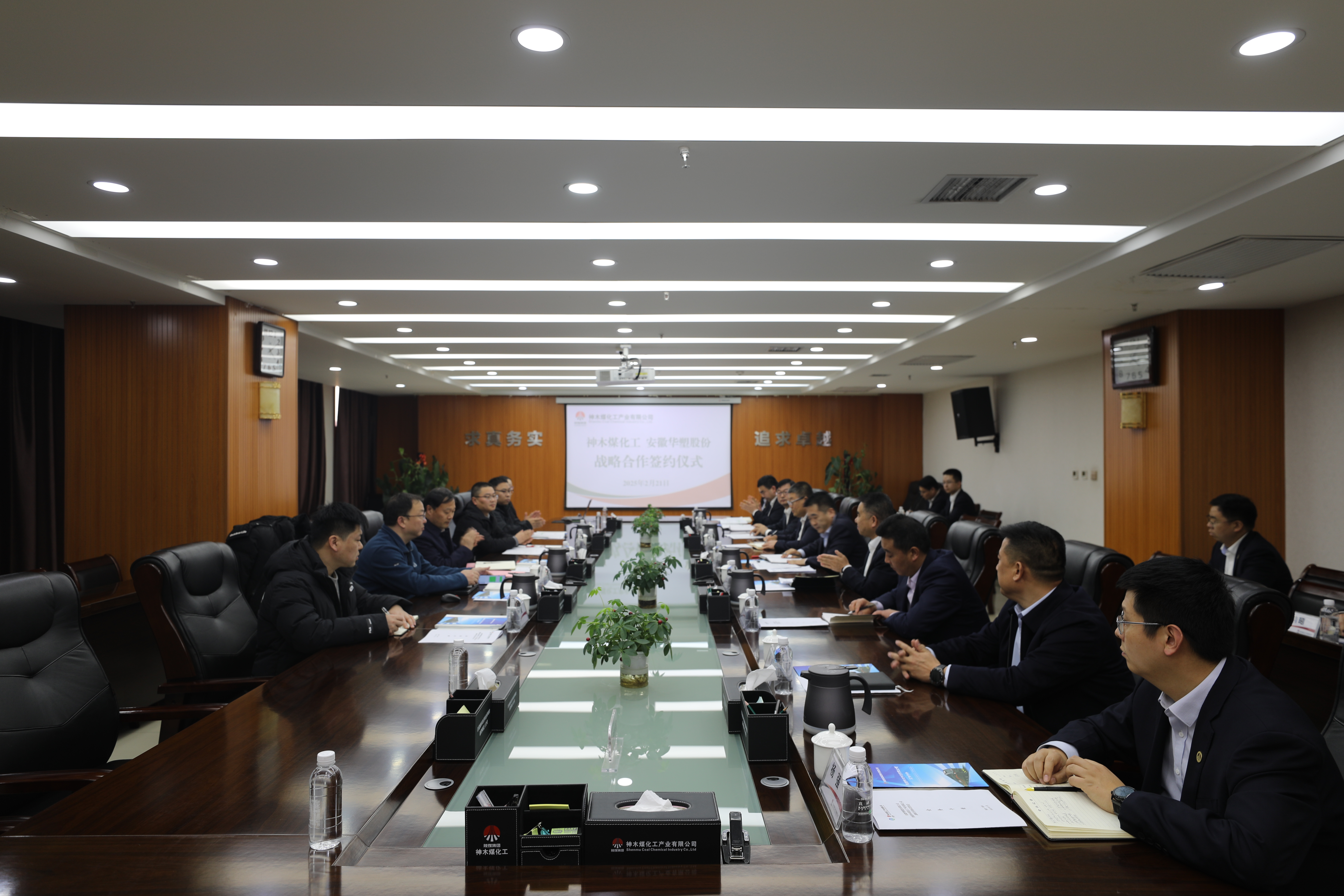 2月21日下午,神木煤化工公司與安徽華塑股份簽訂戰略合作協議。公司總會計師王鑫峰與安徽華塑副總經理李敬陽代表雙方簽約,將共同推動陜皖兩地國企跨區域、跨行業高效協同發展開啟新篇章。公司黨委書記、董事長雷宏春,副總經理、總法律顧問張振濤,天元公司黨委書記、董事長、供銷分公司經理楊旭;安徽華塑黨委書記、董事長路明;神大物流黨支部書記、董事長趙成武等出席儀式。