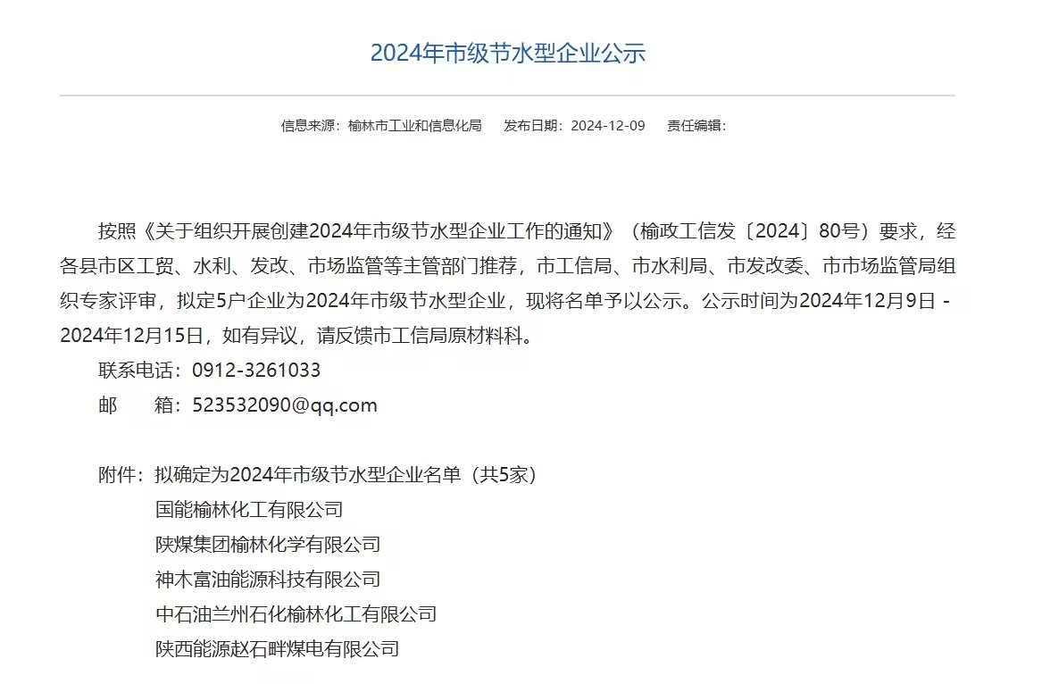 近日,榆林市工業和信息化局公布2024年市級節水型企業名單,神木煤化工富油公司憑借在節水工作中的出色表現榜上有名。
