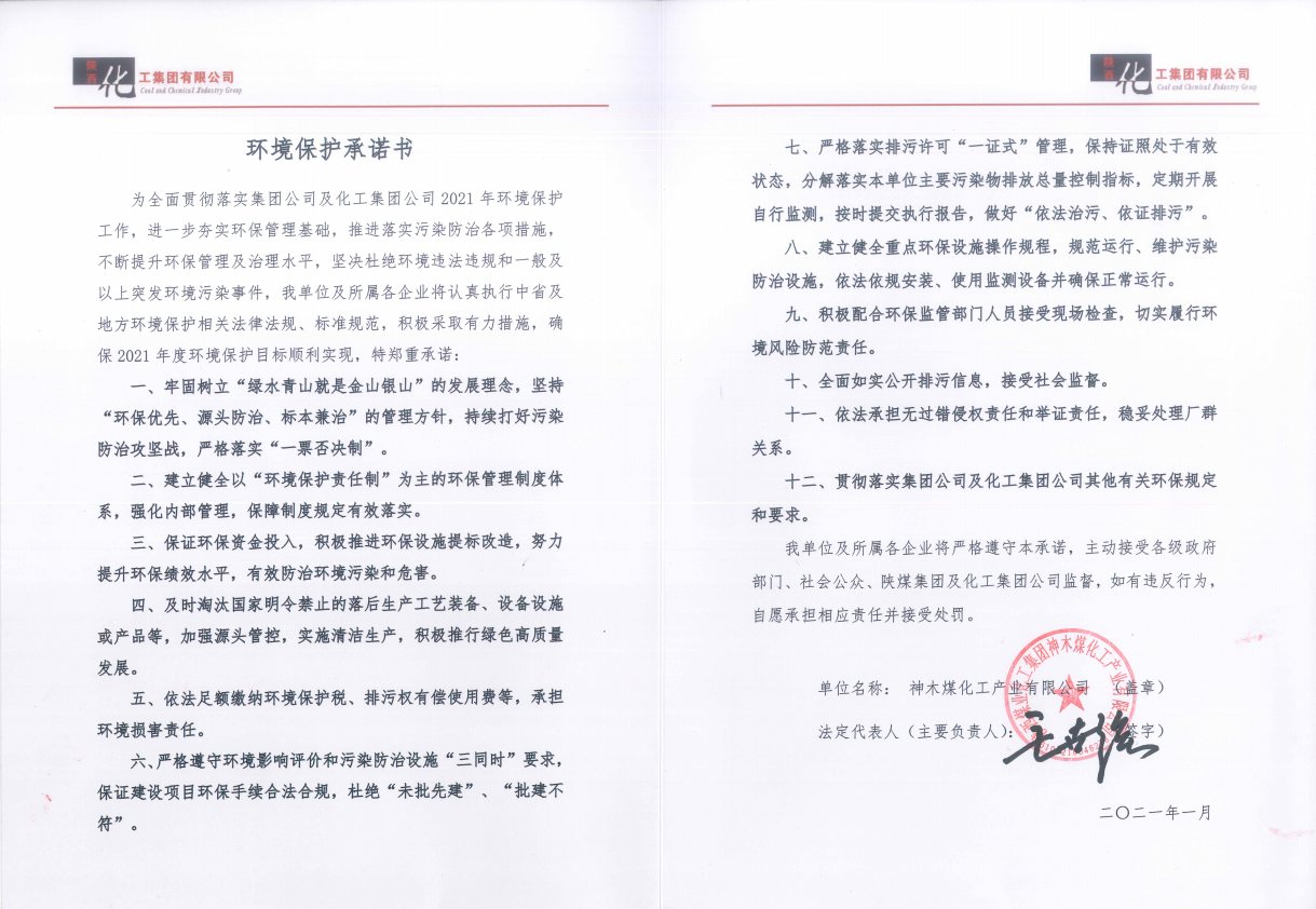 神木煤化工產業有限公司2021年度環境保護承諾書