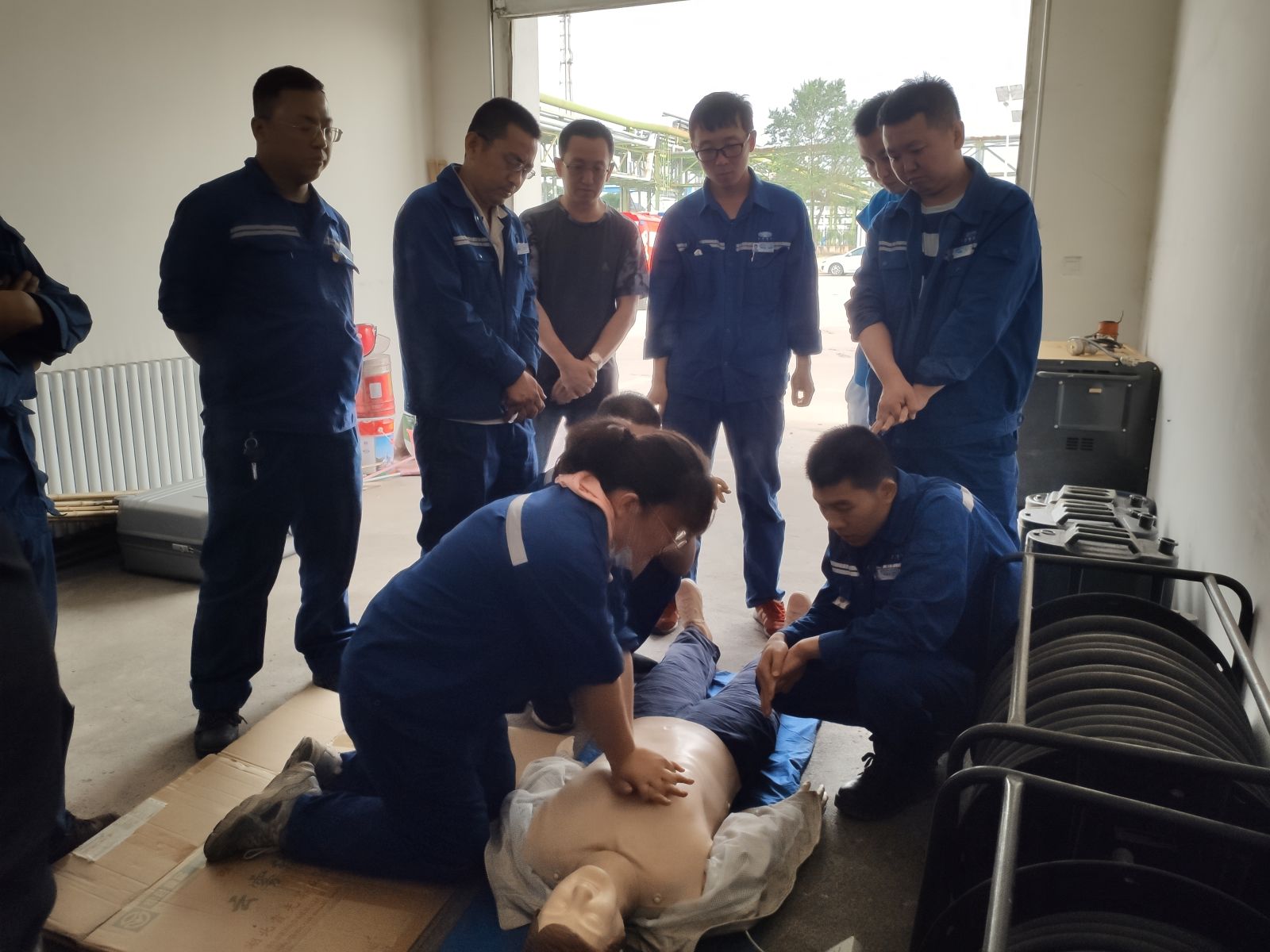 心肺復蘇急救訓練。以心肺復蘇模擬人為示范對象,依照國際心肺復蘇(CPR)指南使大家從意識判斷、急救呼叫、脈搏檢查、呼吸檢查、心肺復蘇、判斷復蘇是否有效等方面系統地熟悉心臟驟?;颊叩募本热^程。天元公司安全環保部戴靜雯用通俗易懂的語言講解了心肺復蘇急救,使用模擬人進行動作示范,讓每位班組長體驗搶救過程,加深操作印象。通過模擬人實時顯示的反饋信息及時調整胸外按壓的位置和按壓力度、人工呼吸吹氣量大小和強度及氣道開放狀態的判斷,使大家近距離、面對面掌握心肺復蘇的技術要領,切實做到方法正確、動作規范,提高員工的急救技能。