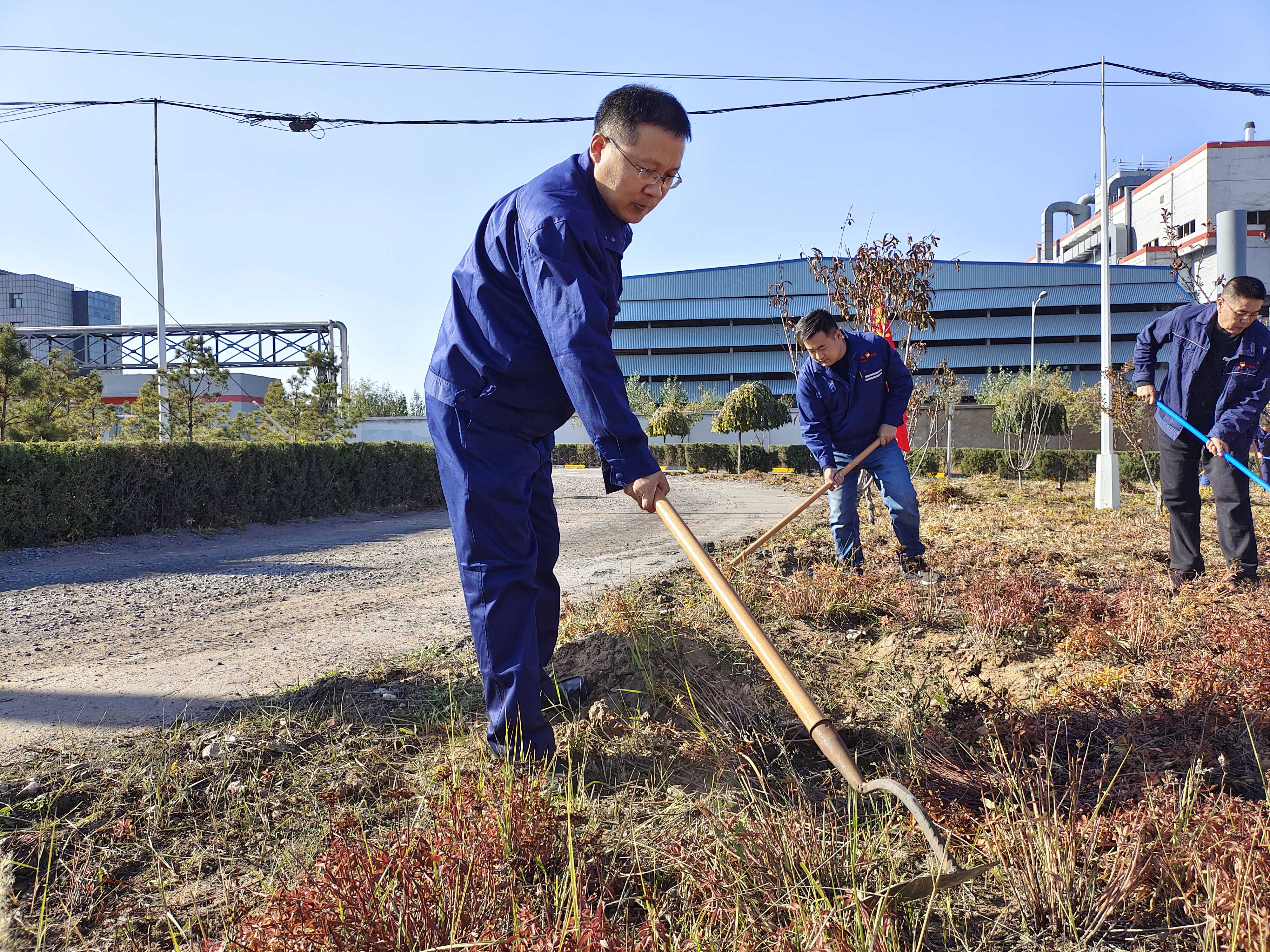 下午15點,大家在能源公司辦公樓前集合并組織進行了簽到后,黨員、團員們迫不及待地戴上手套,帶上鐵鍬、鋤頭等工具,前往能源公司果園區域進行除草行動。