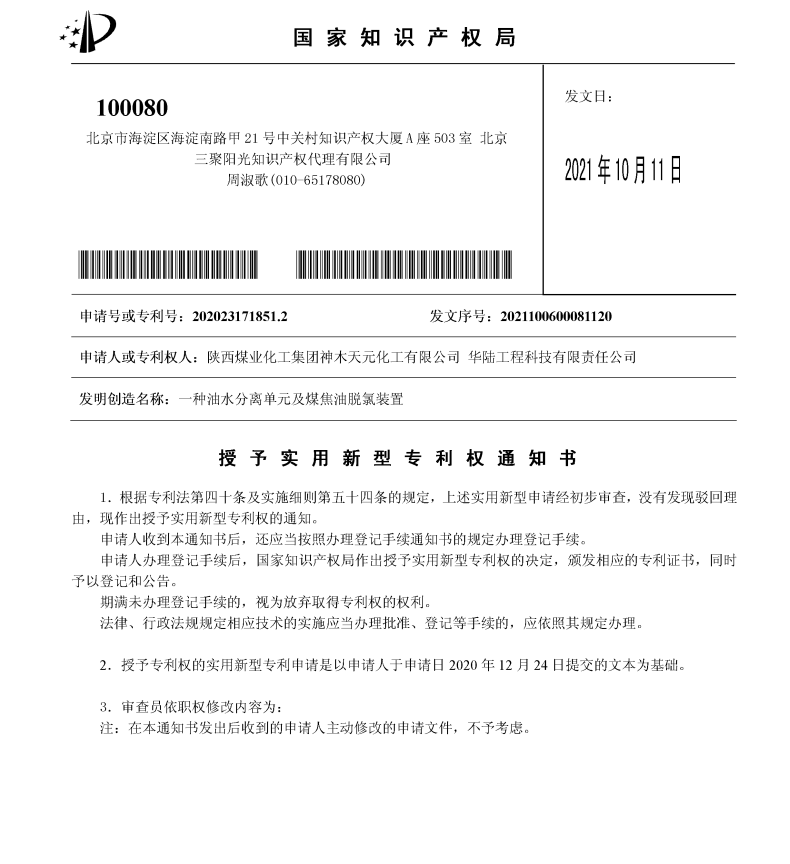 近日,神木煤化工天元公司申請(qǐng)的“一種油水分離單元及煤焦油脫氯裝置”實(shí)用新型專利獲得國家知識(shí)產(chǎn)權(quán)局授權(quán)。