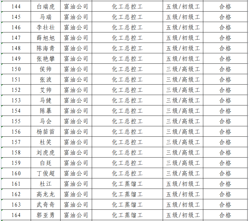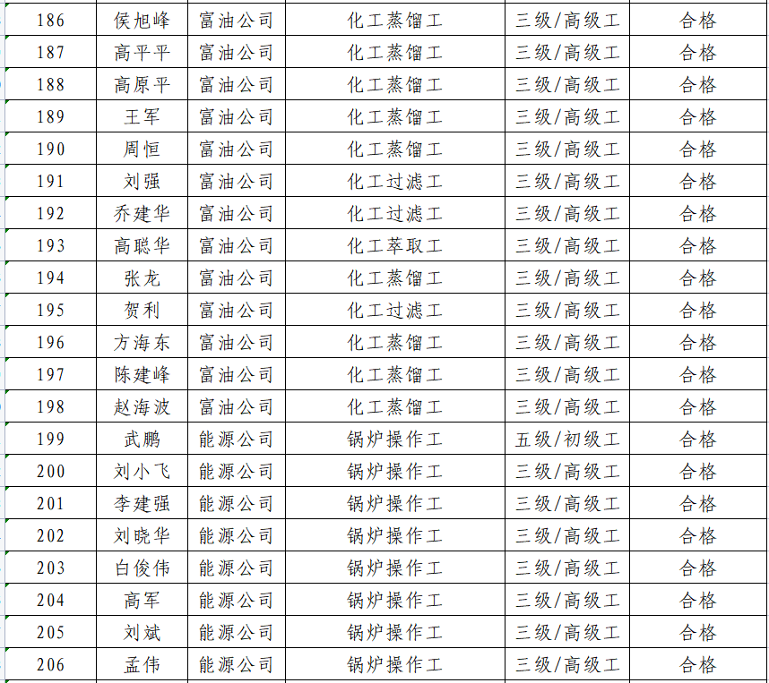 根據神木煤化工《關于開展2021年度職業技能等級認定工作的通知》(神煤化司發〔2021〕218號)文件安排,公司于10月21日至22日組織開展了2021年度初、中、高級職業技能等級認定考核,共366人參加,281人合格(其中:高級工159人,中級工1人,初級工121人)。現將擬通過人員名單進行公示: