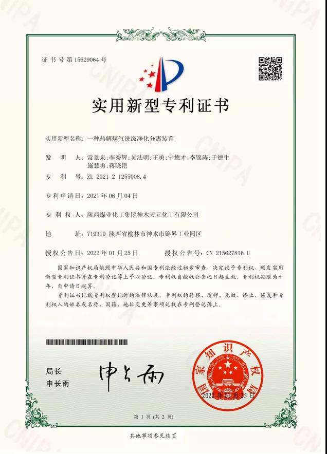 近日,神木煤化工天元公司申請(qǐng)的“一種熱解煤氣洗滌凈化分離裝置”實(shí)用新型專利獲得國(guó)家知識(shí)產(chǎn)權(quán)局授權(quán)。