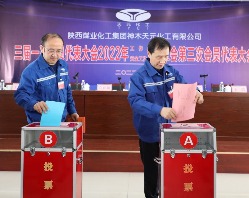會議還聽取審議了天元公司黨委副書記、紀委書記、工會主席樊戰(zhàn)明作的題為《融入中心創(chuàng)實效精準服務聚合力 為公司轉型升級高質(zhì)量發(fā)展提供堅強保障》的二屆工會委員會工作報告,聽取了天元公司安全總監(jiān)王小龍作的題為《深學苦練強本領 防微杜漸保安全 攻堅克難促環(huán)保 降污減排守藍天 為公司轉型升級高質(zhì)量發(fā)展保駕護航》的安全工作報告、《二屆工會經(jīng)費審查委員會工作報告》和《二屆六次會員代表大會提案落實和三屆一次會員代表大會提案征集情況的報告》,選舉產(chǎn)生了新一屆工會委員會委員、工會經(jīng)費審查委員會委員、女職工委員會委員和監(jiān)事會職工代表,表彰了2021年度先進集體和先進個人。