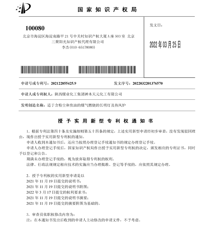 奮進陜煤:神木煤化工天元公司“適于含粉塵和焦油的煤氣燃燒的長明燈及熱風爐”獲國家實用新型專利