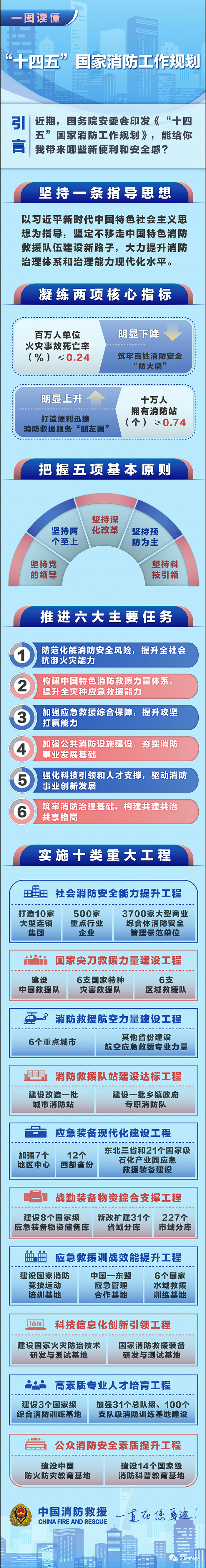 近日,國務院安全生產委員會印發《“十四五”國家消防工作規劃》(以下簡稱《規劃》),對“十四五”時期消防改革發展作出全面部署。為推動《規劃》實施,現就主要內容解讀如下: