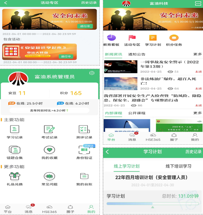 自應急管理部發(fā)布《危險化學品企業(yè)安全培訓空間建設應用指南(試行)》等重要文件以來,富油公司堅決秉持《安全培訓空間》“先合規(guī)再增強”建設思想,扎實推進安全培訓內容規(guī)范化、方式多樣化、管理信息化、方法智能化和監(jiān)管日常化,實現(xiàn)系統(tǒng)性、趣味性、針對性的安全培訓,以提高人員安全素質的要求。在連續(xù)應用HSE365平臺3年后再次啟用新功能,建成了以安全文化“橫向覆蓋”為培訓主線,以安全能力“縱向深入”為空間建設重點的線上線下融合的數(shù)字化安全培訓空間,含有線上安全學習網(wǎng)絡空間、培訓信息管理空間、多媒體教室的線下培訓物理空間。